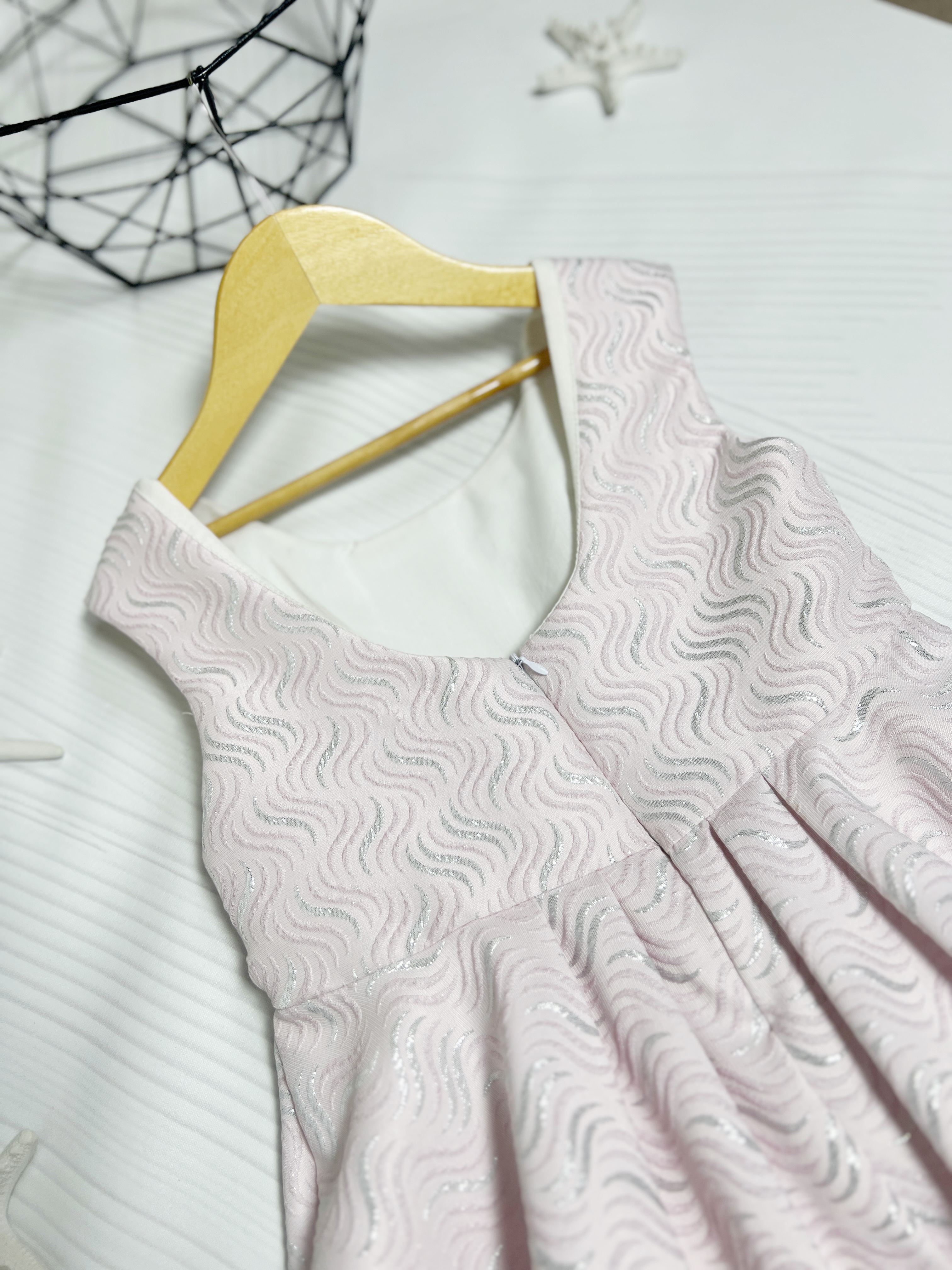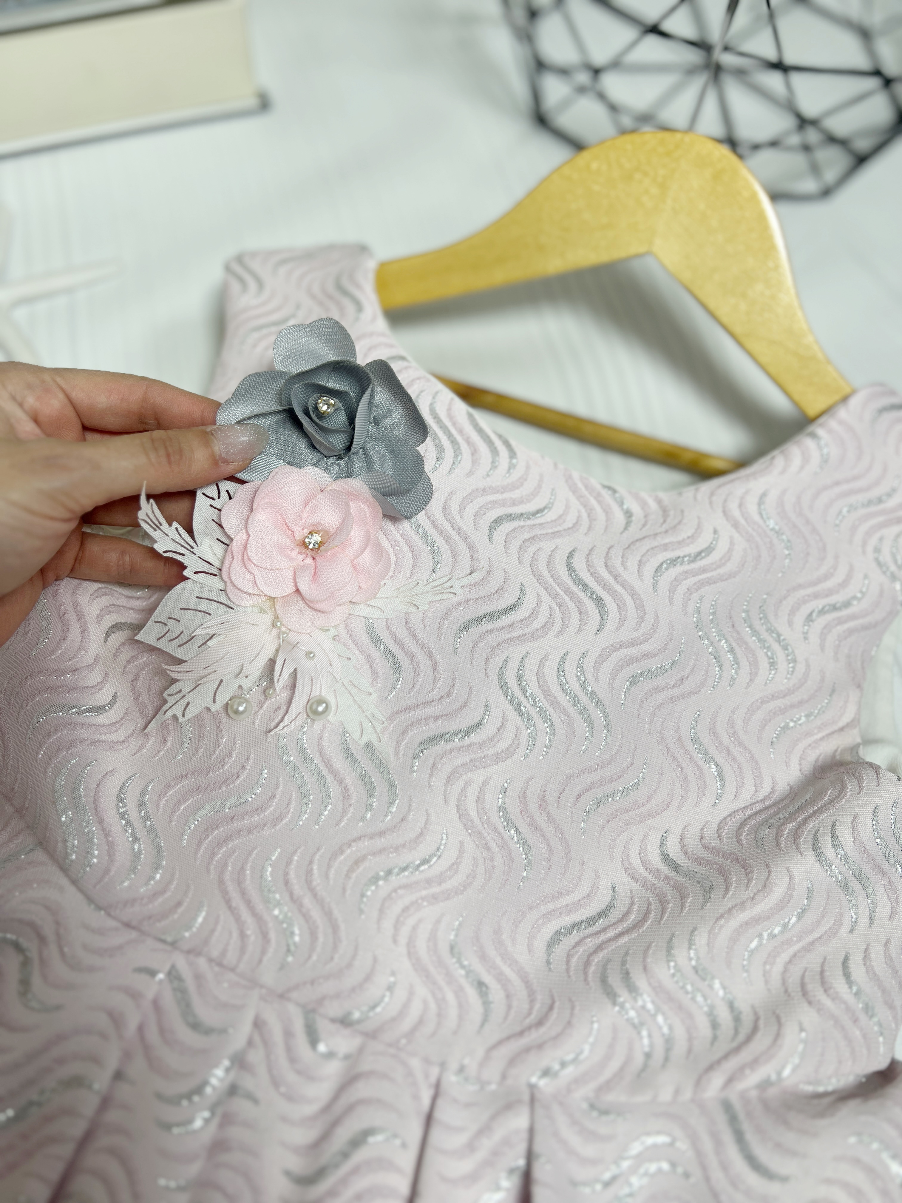 پیراهن دخترونه مجلسی پارچه ژاکارد کیفیت بالا رنگ صورتی ملایم دامن پفی زیر دامن تور فقط یک سایز موجوده قد ۷۵ عرض سینه ۳۱